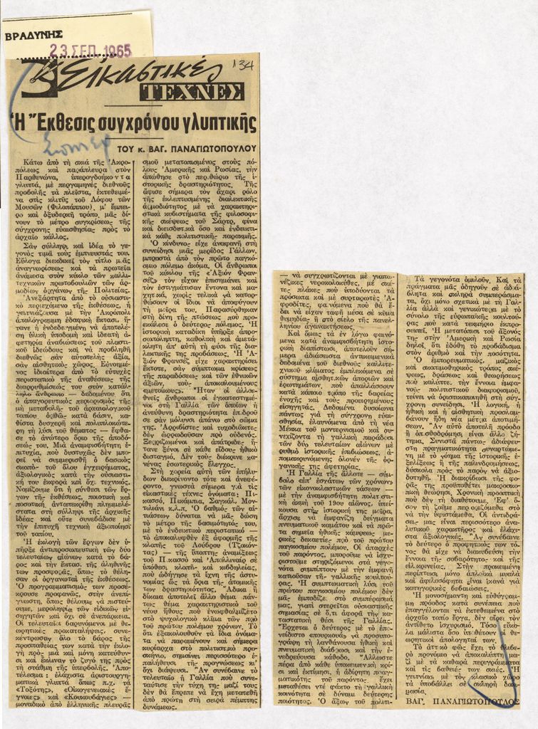 Απόκομμα, χαρτί κολλημένο σε λευκή κόλλα, 29×21 εκ., στα ελληνικά, δημοσίευσης άρθρου το οποίο σχολιάζει τα ‘Παναθήναια της Παγκόσμιας Γλυπτικής’. Σχολιάζεται η επιλογή των έργων, ο χώρος διεξαγωγής της έκθεσης, και η σχέση που αναπτύχθηκε με τη Γαλλία.