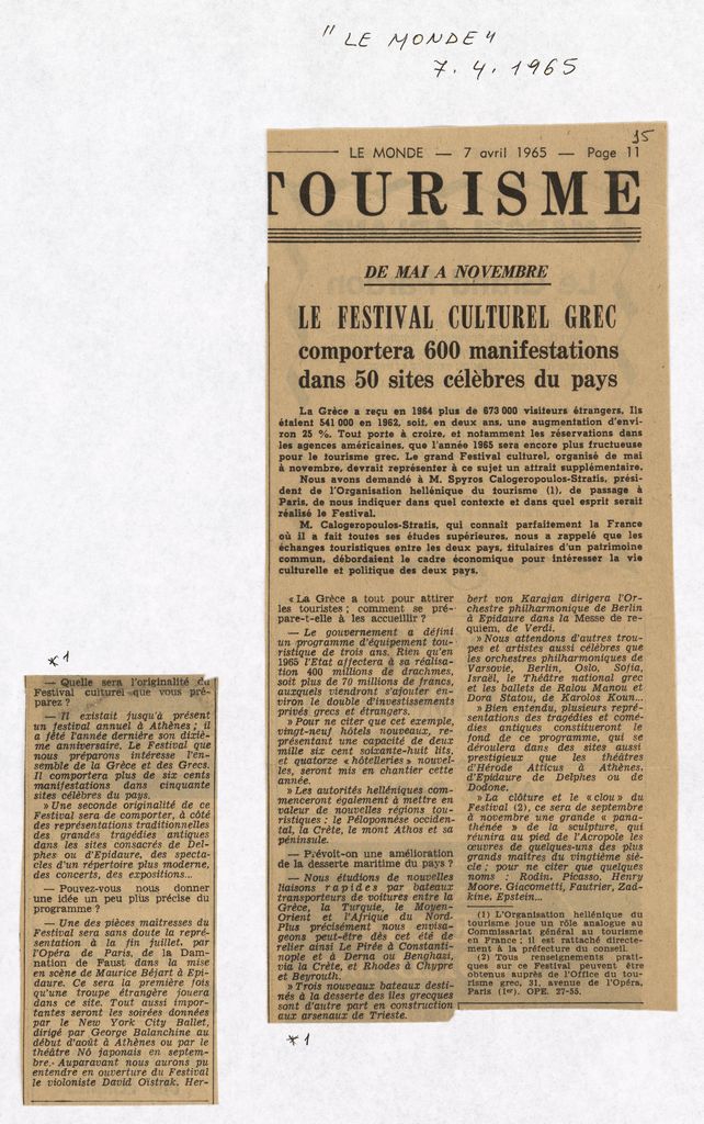Απόκομμα, χαρτί κολλημένο σε λευκή κόλλα, 29×21 εκ., στα γαλλικά, δημοσίευσης συνέντευξης του Σπύρου Καλογερόπουλου-Στρατή. Γίνεται λόγος για την αύξηση στον τουρισμό της χώρας, λόγω των βελτιώσεων στις υποδομές, την χρηματοδότηση επενδύσεων, αλλά και τις καλλιτεχνικές εκδηλώσεις που διοργανώνονται (ανάμεσα στις οποιες τα Παναθήναια της Παγκόσμιας Γλυπτικής), οι οποίες προσελκύουν κόσμο.