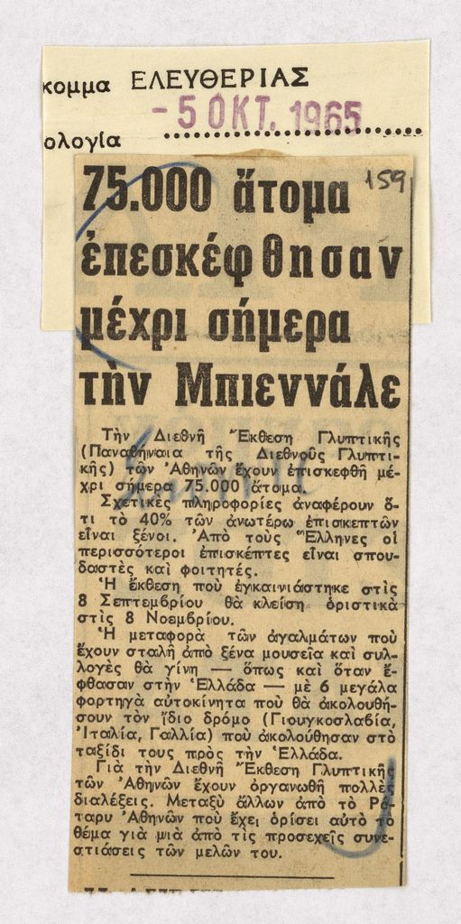 Απόκομμα, χαρτί κολλημένο σε λευκή κόλλα, στα ελληνικά, δημοσίευσης άρθρου το οποίο αναφέρεται στην επισκεψιμότητα των ‘Παναθηναίων της Παγκόσμιας Γλυπτικής’ της Αθήνας.