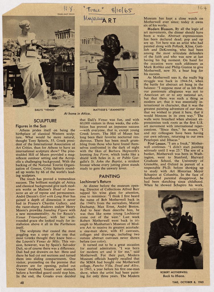 Απόκομμα, χαρτί κολλημένο σε λευκή κόλλα, 29×21 εκ., στα ελληνικά, δημοσίευσης άρθρου το οποίο αναφέρεται στα ‘Παναθήναια της Παγκόσμιας Γλυπτικής’ και στα έργα που παρουσιάζονται εκεί.