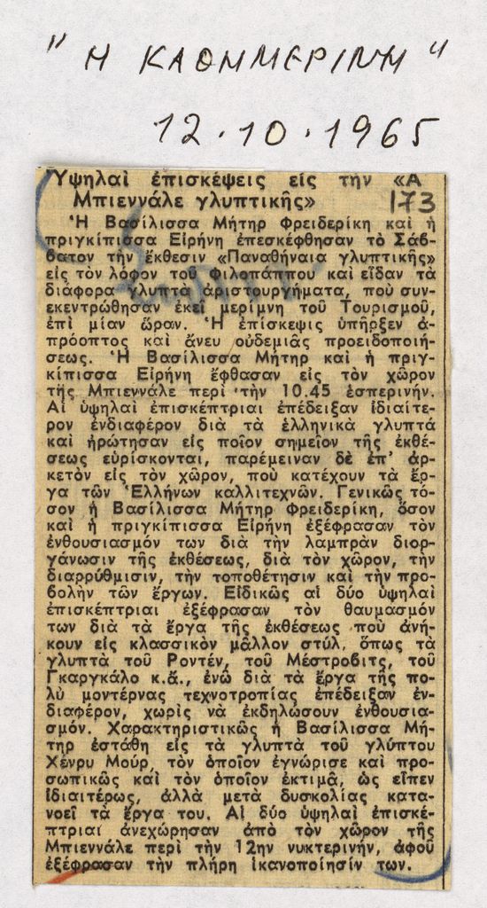 Απόκομμα, χαρτί κολλημένο σε λευκή κόλλα, στα ελληνικά, δημοσίευσης άρθρου το οποίο αναφέρεται στην επίσκεψη της βασίλισσας Φρειδερίκης στα ‘Παναθήναια της Παγκόσμιας Γλυπτικής’ της Αθήνας.