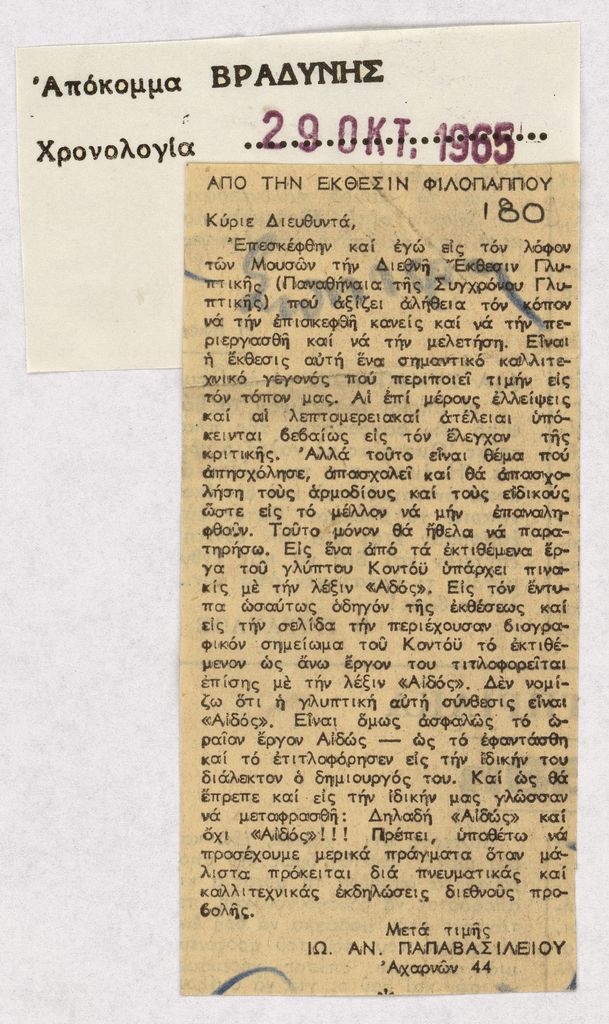 Απόκομμα, χαρτί κολλημένο σε λευκή κόλλα, στα ελληνικά, δημοσίευσης επιστολής προς τον διευθυντή του εντύπου, στην οποία αναγράφονται οι εντυπώσεις που δημιουργήθηκαν μετά από επίσκεψη στα ‘Παναθήναια της Παγκόσμιας Γλυπτικής’ της Αθήνας. Σχολιάζονται τα προβλήματα της διοργάνωσης με ιδιαίτερη αναφορά στην επιγραφή έργου του Condoy.