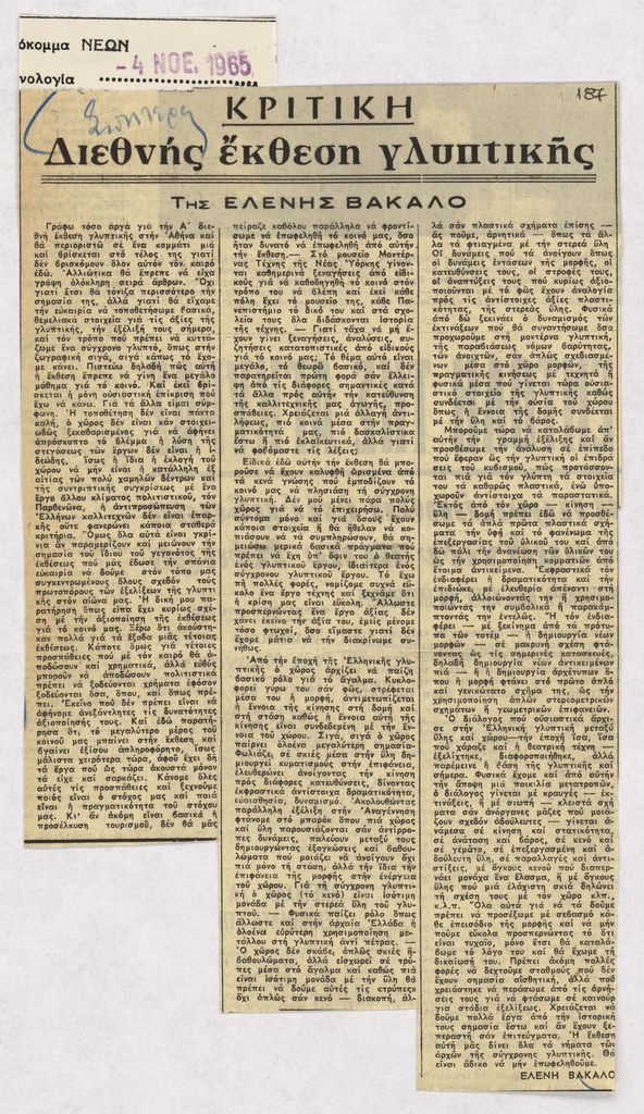 Απόκομμα, χαρτί κολλημένο σε λευκή κόλλα, 29×21 εκ., στα ελληνικά, δημοσίευσης κριτικής των ‘Παναθηναίων της Παγκόσμιας Γλυπτικής’.