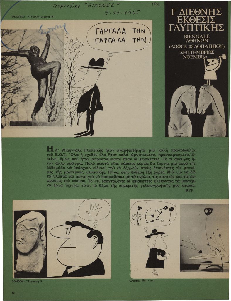 Απόκομμα, χαρτί, 3 φφ, 32×24 εκ., στα ελληνικά, δημοσίευσης γελοιογραφιών του ΚΥΡ, εμπνευσμένων από τα ‘Παναθήναια της Παγκόσμιας Γλυπτικής’.