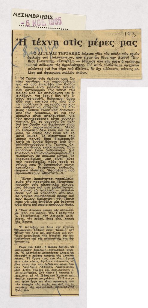 Απόκομμα, χαρτί κολλημένο σε λευκή κόλλα, στα ελληνικά, δημοσίευσης άρθρου το οποίο μεταφέρει εντυπώσεις από την ομιλία του Άγγελου Τερζάκη για την γλυπτική, στον απόηχο των ‘Παναθηναίων της Παγκόσμιας Γλυπτικής’ της Αθήνας.