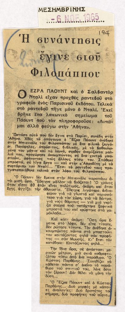 Απόκομμα, χαρτί κολλημένο σε λευκή κόλλα, στα ελληνικά, δημοσίευσης άρθρου το οποίο αναφέρεται στην επίσκεψη του Ezra Pound, στα ‘Παναθήναια της Παγκόσμιας Γλυπτικής’ της Αθήνας.