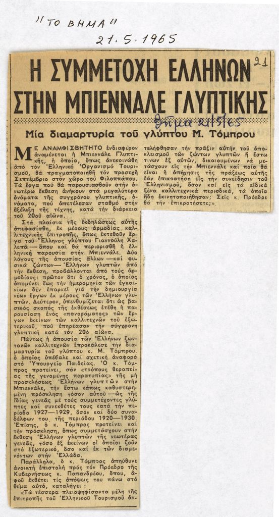 Απόκομμα, χαρτί κολλημένο σε λευκή κόλλα, 29×21 εκ., στα ελληνικά, δημοσίευσης άρθρου αναφερόμενου στη συμμετοχή Ελλήνων καλλιτεχνών στα ‘Παναθήναια της Παγκόσμιας Γλυπτικής’ της Αθήνας, γεγονός που προκάλεσε αντιδράσεις καλλιτεχνών και ειδικότερα του Μιχάλη Τόμπρου. Ο καλλιτέχνης σε αναφορά του προς τον Υπουργό Παιδείας προτείνει τρόπους επιλογής καλλιτεχνών.