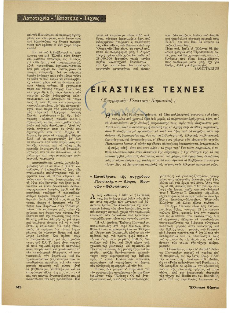 Απόκομμα, χαρτί, 4 φφ, 28×20,5 εκ., στα ελληνικά, δημοσίευσης άρθρου το οποίο σχολιάζει τα ‘Παναθήναια της Παγκόσμιας Γλυπτικής’ της Αθήνας.