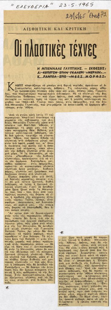 Απόκομμα, χαρτί, 2 τμχ κολλημένα σε λευκή κόλλα, 29×21 εκ., στα ελληνικά, δημοσίευσης άρθρου, το οποίο αναφέρεται στη διοργάνωση των ‘Παναθηναίων της Παγκόσμιας Γλυπτικής’ στην Αθήνα τον Σεπτέμβριο 1965. Ακόμη, γίνεται λόγος για τα έργα του Γιαννούλη Χαλεπά τα οποία θα εκτεθούν και θα εκπροσωπούν την ελληνική γλυπτική, αποκλείοντας νεότερους καλλιτέχνες. Φέρει επιγραφή.
