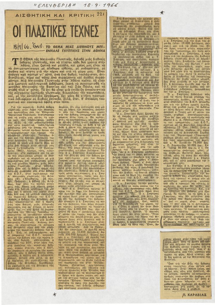 Απόκομμα, χαρτί κολλημένο σε λευκή κόλλα, 29X21 εκ., στα ελληνικά, δημοσίευσης άρθρου το οποίο σχολιάζει τα ‘Παναθήναια της Παγκόσμιας Γλυπτικής’ της Αθήνας και ειδικότερα δημοσίευση του Τώνη Σπητέρη στην “Ελευθερία” στις 11/09/1966, στην οποία απαντά σε επικρίσεις που έγιναν για τη διοργάνωση της έκθεσης.