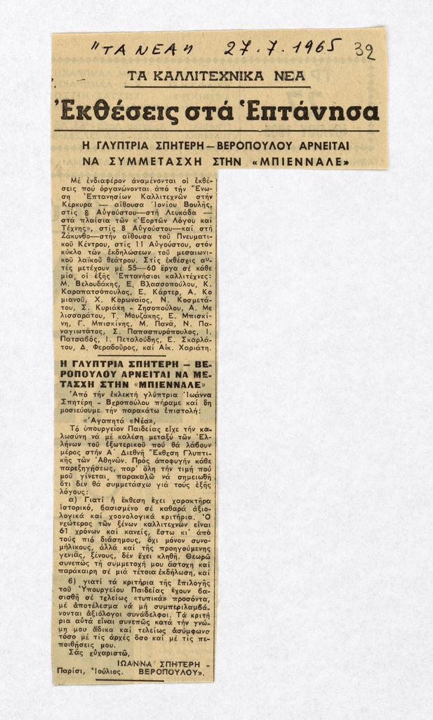 Απόκομμα, χαρτί κολλημένο σε λευκή κόλλα, στα ελληνικά, δημοσίευσης άρθρου αναφερόμενου σε εκθέσεις που διοργανώνονται από την Ένωση Επτανήσιων Καλλιτεχνών στην Κέρκυρα. Σημειώνονται τα ονόματα των συμμετεχόντων καλλιτεχνών. Ακόμη, δημοσιεύεται επιστολή της Ιωάννας Σπητέρη-Βεροπούλου, στην οποία αναλύει τους λόγους για τους οποίους αρνείται να συμμετέχει στην Μπιεννάλε Γλυπτικής της Αθήνας (Παναθήναια).