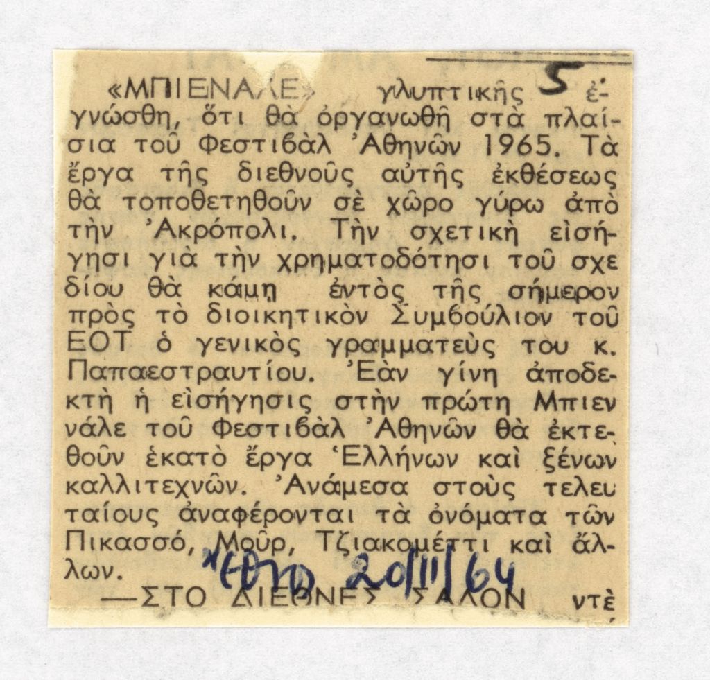 Απόκομμα, χαρτί, 5×5 εκ., στα ελληνικά, δημοσίευσης άρθρου αναφερόμενου στην διοργάνωση της Μπιεννάλε Γλυπτικής (Παναθήναια) στην Αθήνα το 1965. Γίνεται λόγος για εισήγηση για τη χρηματοδότηση της διοργάνωσης, ενώ δίνονται ονόματα συμμετεχόντων καλλιτεχνών.
