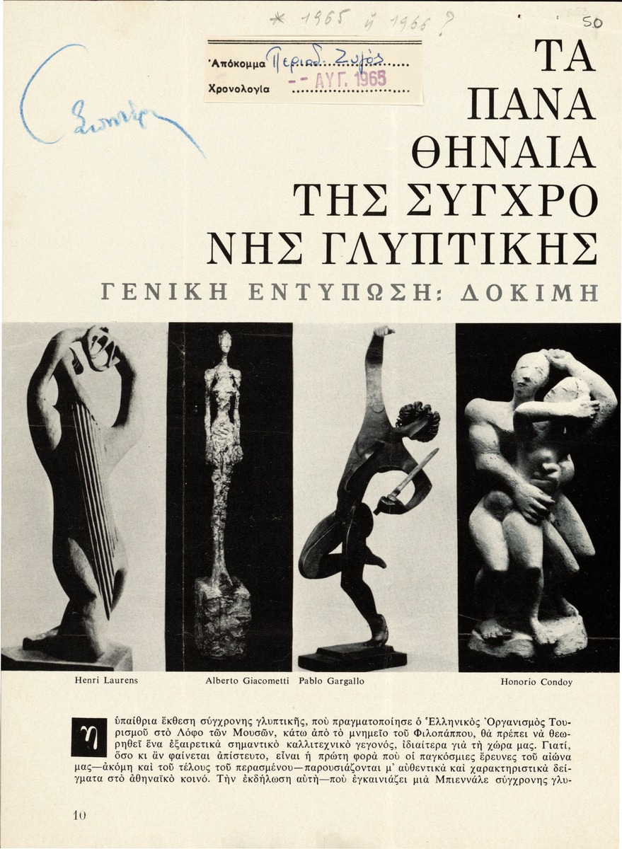 Απόκομμα του περιοδικού “Ζυγός” (τεύχος 08/1965), όπου δημοσιεύεται άρθρο με θέμα τα “Παναθήναια της Παγκόσμιας Γλυπτικής” που διοργανώθηκαν στην Αθήνα.