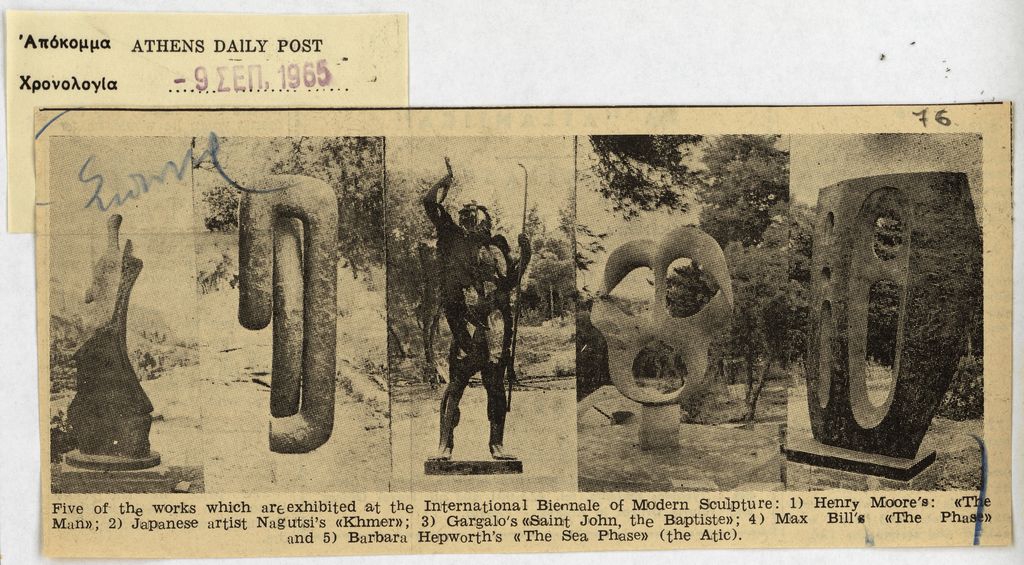 Απόκομμα, χαρτί κολλημένο σε λευκή κόλλα, 29×21 εκ., στα αγγλικά, δημοσίευσης αναπαραγωγών ορισμένων έργων που παρουσιάζονται στα ‘Παναθήναια της Παγκόσμιας Γλυπτικής’ στην Αθήνα.