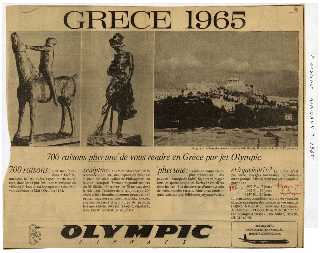 Απόκομμα, χαρτί, 22.5×28 εκ., στα γαλλικά, δημοσίευσης διαφήμισης των Ολυμπιακών Αερογραμμών, με αφορμή τις καλλιτεχνικές εκδηλώσεις που διοργανώνονται στην Ελλάδα το 1965. Ανάμεσα σε αυτές τα ‘Παναθήναια της Παγκόσμιας Γλυπτικής’, όπου συμμετέχουν εξέχοντες καλλιτέχνες. Το απόκομμα εικονογραφείται και φέρει επιγραφή.