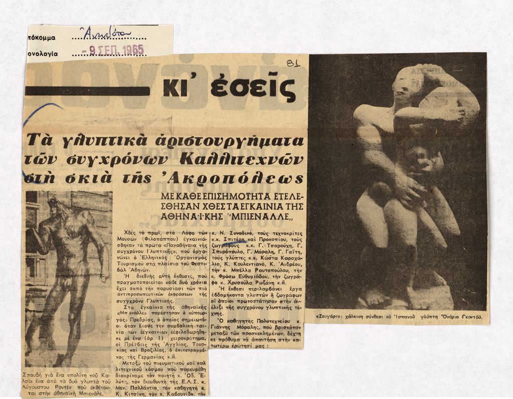 Απόκομμα, χαρτί κολλημένο σε λευκή κόλλα, 2 φφ, στα ελληνικά, δημοσίευσης άρθρου το οποίο αναφέρεται στα εγκαίνια των ‘Παναθηναίων της Παγκόσμιας Γλυπτικής’ της Αθήνας.