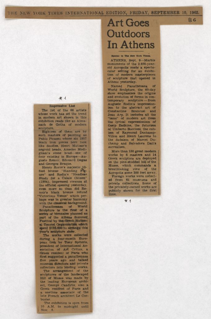 Απόκομμα, χαρτί κολλημένο σε λευκή κόλλα, στα αγγλικά, δημοσίευσης άρθρου αναφερόμενου στα ‘Παναθήναια της Παγκόσμιας Γλυπτικής’ της Αθήνας.