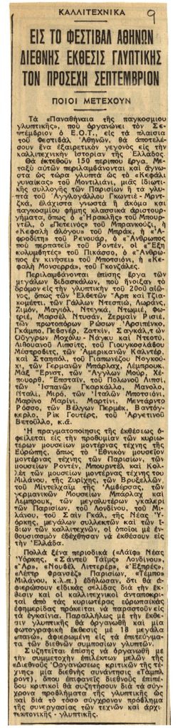 Απόκομμα, χαρτί κολλημένο σε λευκή κόλλα, 23,5×5 (29,5×21) εκ., στα ελληνικά, δημοσίευσης άρθρου αναφερόμενου στην διοργάνωση των ‘Παναθηναίων της Παγκόσμιας Γλυπτικής’ στην Αθήνα τον Σεπτέμβριο 1965.