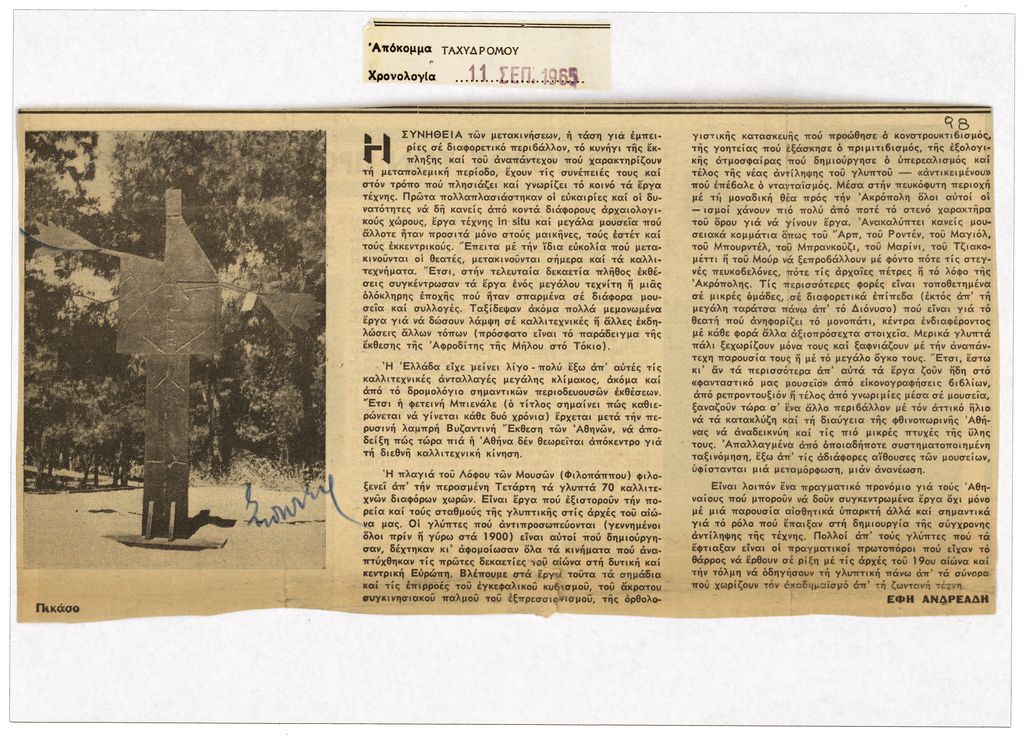 Απόκομμα, χαρτί κολλημένο σε λευκή κόλλα, στα ελληνικά, δημοσίευσης άρθρου αναφερόμενου στα ‘Παναθήναια της Παγκόσμιας Γλυπτικής’ της Αθήνας. Γίνεται λόγος για τους συμμετέχοντες καλλιτέχνες και τα έργα τους. Επίσης, σχολιάζεται ο χώρος διεξαγωγής της έκθεσης και η σημασία της διοργάνωσης.