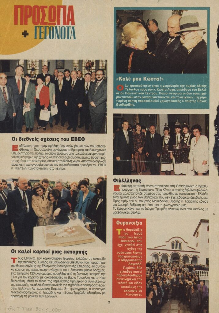 Απόκομμα του περιοδικού «Τηλέραμα», τεύχος 115 (07/05/1994), όπου δημοσιεύεται φωτογραφία της Αλίκης Τέλλογλου που συνομιλεί με τον Κώστα Λαχά, υπεύθυνο του “Βελλίδειου Πολιτιστικού Κέντρου” στη Θεσσαλονίκη.