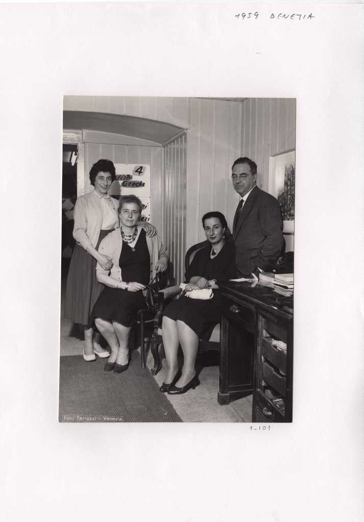 Φωτογραφία, α/μ, φωτογραφικό χαρτί, 13×18 εκ., επικολλημένη σε φύλλο χαρτί Α4 με ένα ακόμη τεκμήριο. Ομαδική φωτογραφία από τα εγκαίνια της ομαδικής έκθεσης τεσσάρων Ελληνίδων εικαστικών στη Βενετία το 1951. Όρθιος δεξιά, ο Τώνης Σπητέρης. Στην πίσω όψη, επιγραφή, στα ελληνικά και ιταλικά και σφραγίδα του φωτογραφικού στούντιο Ferruzzi.
