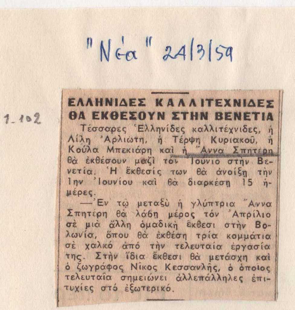 Απόκομμα, έντυπο, στα ελληνικά, χαρτί, 5×5 εκ., όπου δημοσιεύεται αναγγελία ομαδικής έκθεσης τεσσάρων Ελληνίδων εικαστικών στη Βενετία και η συμμετοχή της Ι. Σπητέρη και του Ν. Κεσσανλή σε ομαδική έκθεση στη Μπολόνια. Το απόκομμα είναι επικολλημένο σε απόκομμα, 17×16 εκ., μαζί με τρία ακόμα αποκόμματα όπου δημοσιεύονται άρθρα με το ίδιο θέμα. Πάνω από το απόκομμα, επιγραφή.