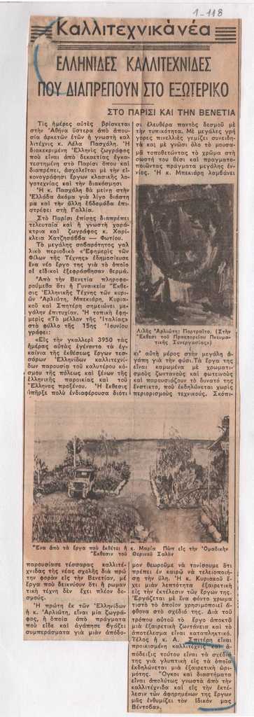 Απόκομμα, έντυπο, στα ελληνικά, χαρτί, 29×9 εκ., επικολλημένο σε φύλλο χαρτιού Α4 μαζί με ένα ακόμα τεκμήριο. Αναδημοσιεύεται μεταφρασμένο απόσπασμα κριτικής από τον ιταλικό τύπο για την έκθεση τεσσάρων Ελληνίδων εικαστικών στη Βενετία. Το απόκομμα εικονογραφείται. Δίπλα στο απόκομμα, επιγραφή