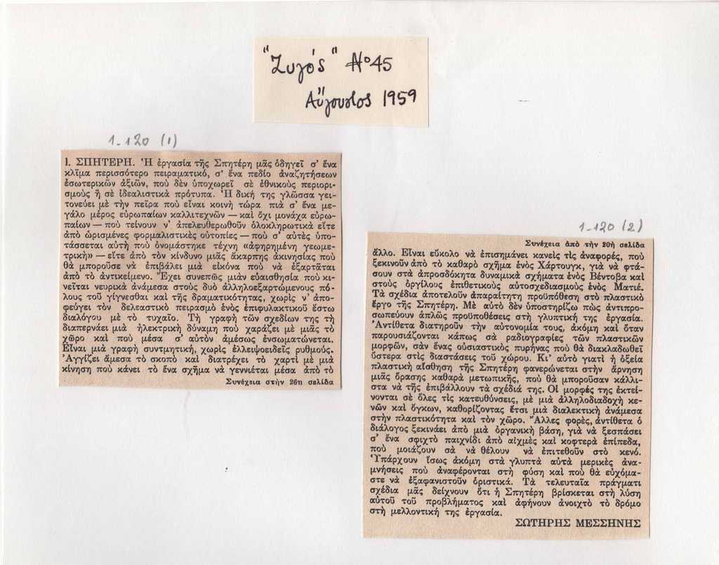 Απόκομμα, έντυπο, στα ελληνικά, χαρτί, δύο τμήματα: 7×8,5 εκ. και 9×8,5 εκ., επικολλημένα σε φύλλο χαρτιού Α4 μαζί με ένα ακόμη τεκμήριο. Δημοσιεύεται άρθρο του Σ. Μεσσήνη για το καλλιτεχνικό έργο της Ι. Σπητέρη. Πάνω από το τεκμήριο επικολλημένο απόκομμα, με επιγραφή.
