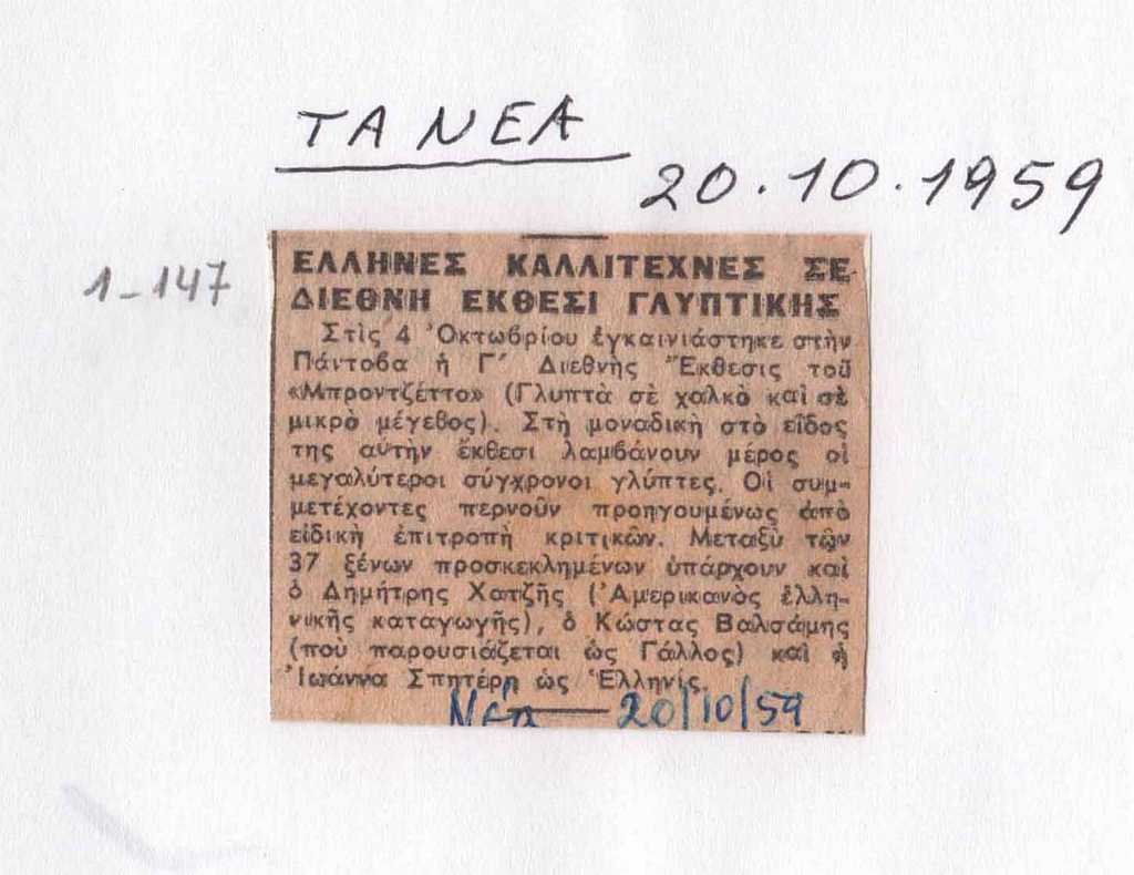 Απόκομμα, έντυπο, στα ελληνικά, χαρτί, 4×5 εκ. Δημοσίευμα με θέμα τη συμμετοχή Ελλήνων καλλιτεχνών στον 3ο Διεθνή Διαγωνισμό Χάλκινων Έργων στην Πάδοβα το 1959. Επικολλημένο σε φύλλο χαρτιού Α4 με άλλα τέσσερα τεκμήρια. Στο κάτω μέρος, επιγραφή