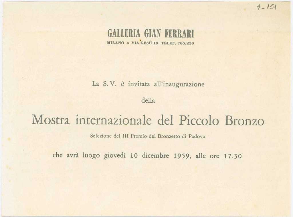 Έντυπο, στα ιταλικά, μονόφυλλο, χαρτόνι, δύο όψεις, 12×16 εκ. Πρόσκληση ομαδικής έκθεσης που διοργανώθηκε στο Μιλάνο το 1959. Στην μία όψη, ονόματα των συμμετεχόντων καλλιτεχνών