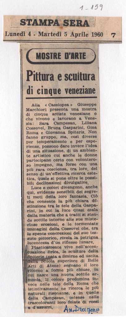 Απόκομμα, έντυπο, στα ιταλικά, χαρτί, 17×7 εκ., επικολλημένο σε φύλλο χαρτί Α4 με ένα ακόμη τεκμήριο. Κριτική της ομαδικής έκθεσης πέντε γυναικών εικαστικών από την περιοχή του Βένετο στο Τορίνο το 1960.