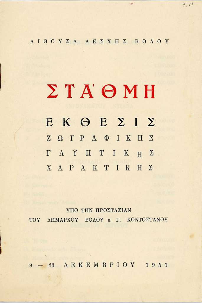 Έντυπο, στα ελληνικά, τεύχος, 4 φύλλα δύο όψεων, χαρτί, 21,5×14,5 εκ., επικολλημένο σε φύλλο χαρτί Α4. Τιμοκατάλογος έκθεσης της ομάδας καλλιτεχνών «Στάθμη» που πραγματοποιήθηκε στον Βόλο το 1951.