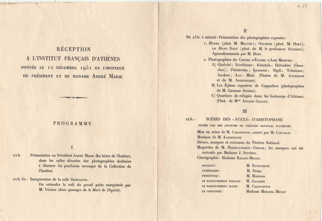 Έντυπο, στα γαλλικά, δίφυλλο, χαρτί, 20×15 εκ. Πρόγραμμα εκδηλώσεων για την υποδοχή του Γάλλου Υπουργού Παιδείας Andre Marie στο Γαλλικό Ινστιτούτο Αθηνών. Περιλαμβάνονται έκθεση φωτογραφίας και σκηνές από την παράσταση «Νεφέλαι» του Αριστοφάνη, σε σκηνοθεσία Σ. Καραντινού που ανέβηκε από το Εθνικό Θέατρο το 1951.