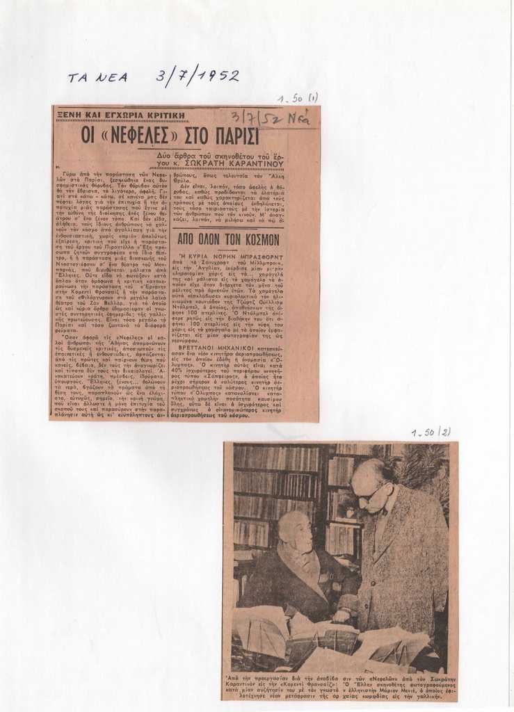 Απόκομμα, έντυπο, χαρτί, δύο τμήματα, 13×11 εκ. και 10,5×10 εκ. Απόσπασμα άρθρου του Σ. Καραντινού ως απάντηση σε δυσμενείς κριτικές που δέχθηκε η παράσταση «Νεφέλαι» του Αριστοφάνη στο Παρίσι το 1952 από μερίδα του γαλλικού και ελληνικού τύπου. Στο πρώτο απόκομμα, επιγραφή.