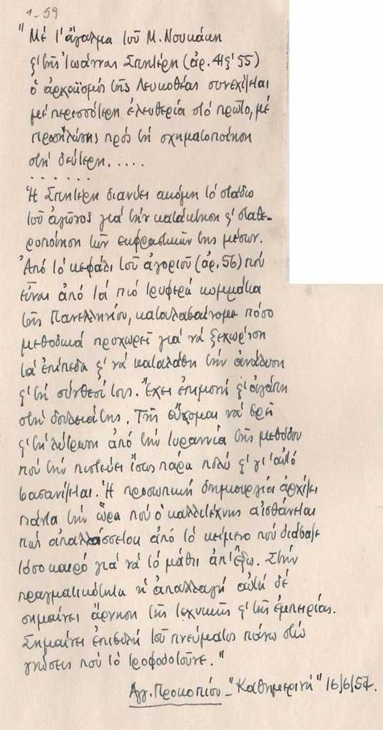 Κείμενο, χειρόγραφο, με μπλε μελάνι, στα ελληνικά, σε χαρτί, 26×18,5 εκ., μέρος κολλάζ δημοσιευμάτων για τη συμμετοχή της Ι. Σπητέρη στην Ε’ Πανελλήνιο Καλλιτεχνική Έκθεση στην Αθήνα το 1957. Επιγραφές.