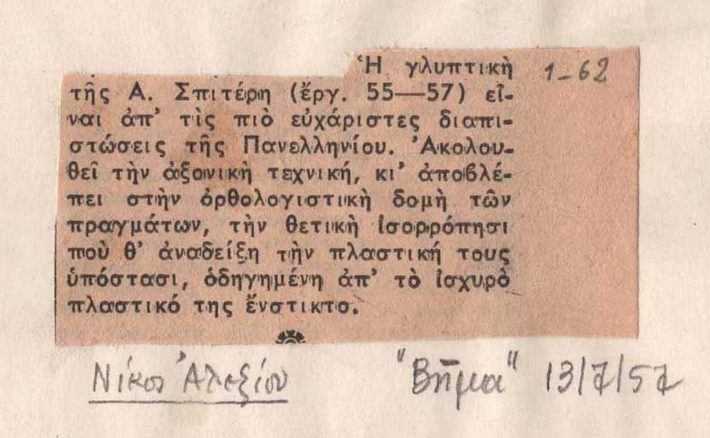 Απόκομμα, έντυπο, στα ελληνικά, χαρτί, 3×6 εκ., μέρος κολλάζ δημοσιευμάτων για τη συμμετοχή της Ι. Σπητέρη στην Ε’ Πανελλήνιο Καλλιτεχνική Έκθεση στην Αθήνα το 1957. Επιγραφές.