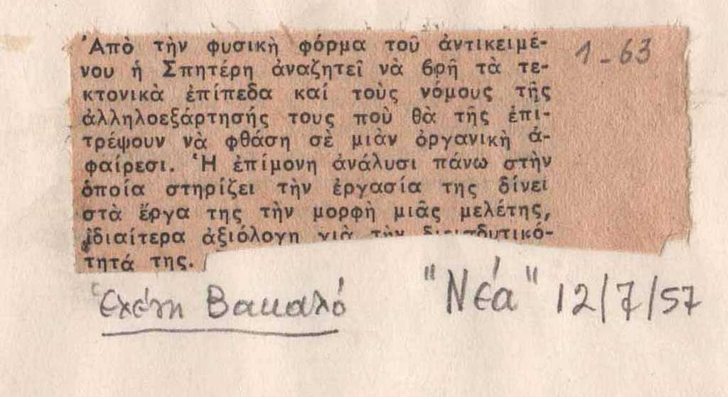 Απόκομμα, έντυπο, στα ελληνικά, χαρτί, 2,5×6 εκ., μέρος κολλάζ δημοσιευμάτων για τη συμμετοχή της Ι. Σπητέρη στην Ε’ Πανελλήνιο Καλλιτεχνική Έκθεση στην Αθήνα το 1957. Επιγραφές.
