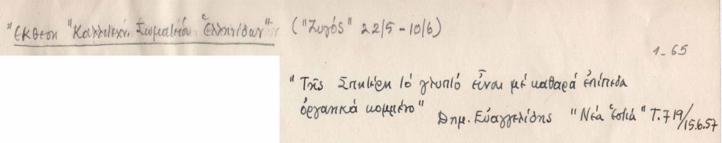 Κείμενο, χειρόγραφο, με μαύρο μελάνι, στα ελληνικά, σε απόκομμα χαρτιού 14,5×19,5 εκ. Απόσπασμα κριτικής του Δ. Ευαγγελίδη για το έργο της Ι. Σπητέρη που παρουσιάστηκε στην Έκθεση Καλλιτεχνών Σωματείου Ελληνίδων στην Αθήνα το 1957. Επάνω, σημείωση, χειρόγραφη με μολύβι. Στο ίδιο απόκομμα επικολλημένο απόκομμα εφημερίδας με το ίδιο θέμα.