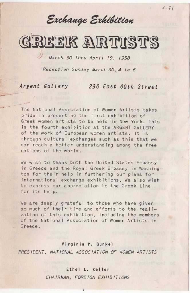 Έντυπο, στα αγγλικά, δίπτυχο, χαρτί, 21×14 εκ., της ομαδικής έκθεσης Ελληνίδων εικαστικών που πραγματοποιήθηκε στη Νέα Υόρκη το 1958.