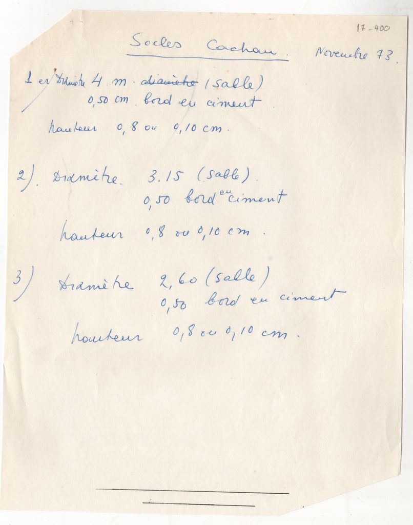 Κείμενο, χειρόγραφο, με μολύβι και μπλε μελάνι, στα γαλλικά, χαρτί, δύο σελίδες, 27×20 εκ. Στις σημειώσεις η Ι. Σπητέρη αναφέρει τα στοιχεία του έργου ενώ υπάρχει και ένα σχέδιο για την τοποθέτησή του στο σχολείο στο Cachan της Γαλλίας.