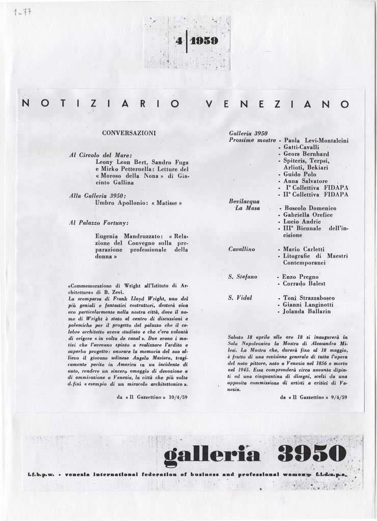 Φωτοαντίγραφο αποκόμματος εντύπου, στα ιταλικά, χαρτί, επικολλημένο σε φύλλο Α4. Αναγγέλεται επικείμενη ομαδική έκθεση τεσσάρων Ελληνίδων εικαστικών στη Βενετία το 1959.