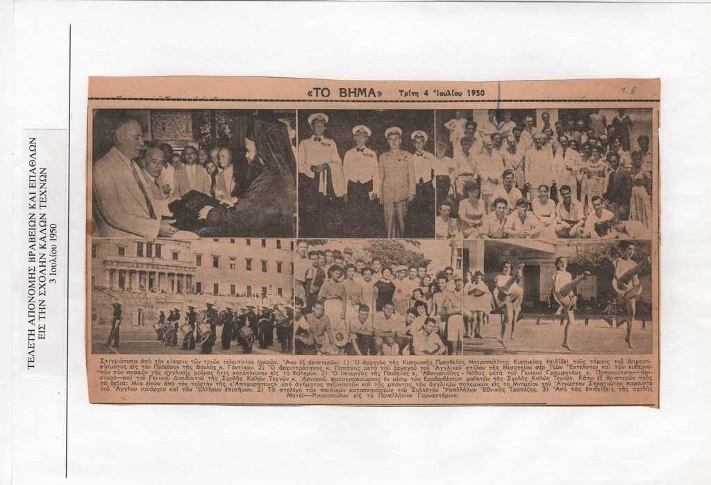 Απόκομμα, έντυπο, στα ελληνικά, χαρτί, 13,5×24 εκ., επικολλημένο σε λευκή κόλλα χαρτί. Αριστερά, απόκομμα χαρτιού με εκτύπωση κειμένου: Τελετή απονομής βραβείων και επάθλων εις την Σχολήν Καλών Τεχνών 3 Ιουλίου 1950. Δημοσίευση φωτογραφικών στιγμιοτύπων γεγονότων στην Αθήνα το καλοκαίρι 1950.