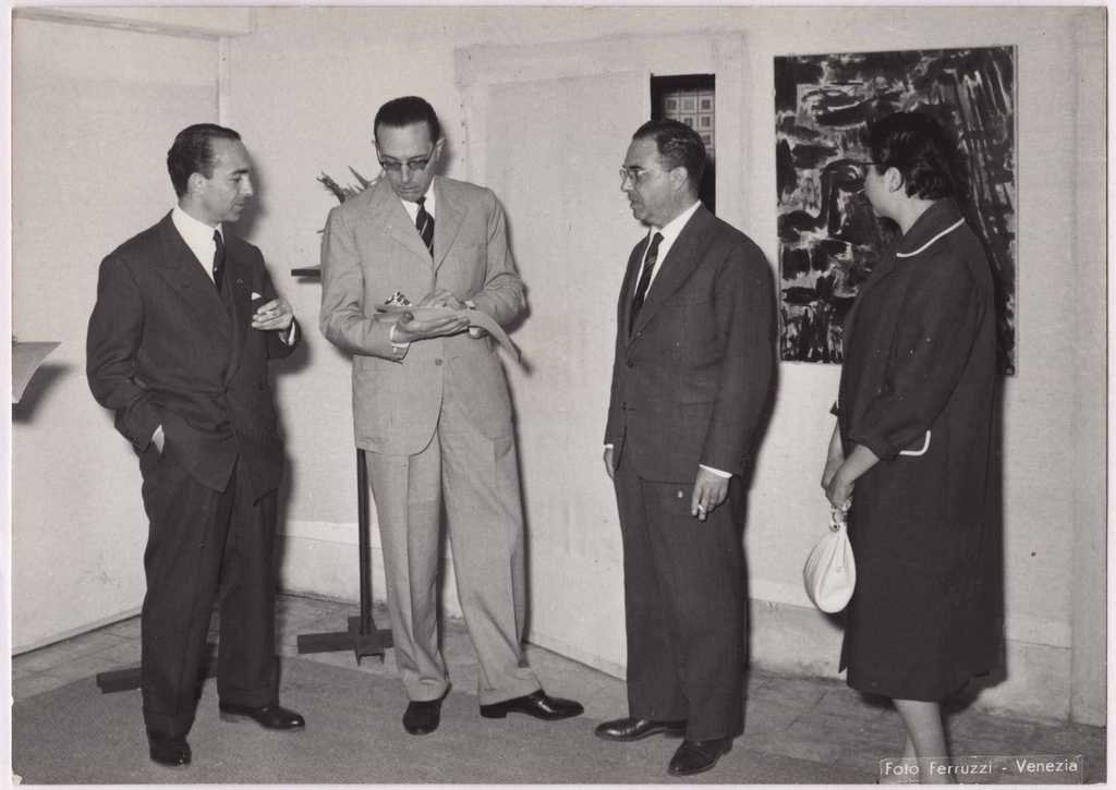 Φωτογραφία, α/μ, φωτογραφικό χαρτί, 13×18 εκ., επικολλημένη σε φύλλο χαρτί Α4 με ένα ακόμη τεκμήριο. Στιγμιότυπο από τα εγκαίνια της ομαδικής έκθεσης τεσσάρων Ελληνίδων εικαστικών στη Βενετία το 1951. Δεύτερος από αριστερά ο νομάρχης της Βενετίας, Τ. Σπητέρης και η Ι. Σπητέρη. Στην πίσω όψη, επιγραφή, στα ελληνικά και ιταλικά και σφραγίδα του φωτογραφικού στούντιο Ferruzzi.
