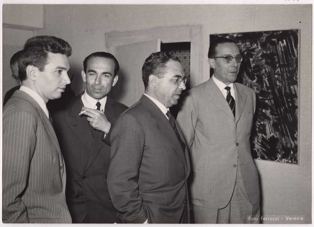 Φωτογραφία, α/μ, φωτογραφικό χαρτί, 13×18 εκ., επικολλημένη σε φύλλο χαρτί Α4 με ένα ακόμη τεκμήριο. Στιγμιότυπο από τα εγκαίνια της ομαδικής έκθεσης τεσσάρων Ελληνίδων εικαστικών στη Βενετία το 1951. Διακρίνονται ο Σ. Μεσσήνης (πρώτος αριστερά), ο διπλωμάτης Α. Κοραντής, Τ. Σπητέρης και ο νομάρχης της Βενετίας (δεξιά). Στην πίσω όψη, επιγραφή, στα ελληνικά και ιταλικά και σφραγίδα του φωτογραφικού στούντιο Ferruzzi.