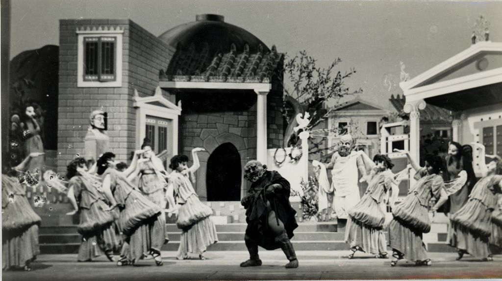 Φωτογραφία, α/μ, φωτογραφικό χαρτί, 9,5×17,5 εκ., επικολλημένη σε φύλλο χαρτιού Α4 μαζί με επτά ακόμη φωτογραφίες. Στιγμιότυπο από την παράσταση το 1951.