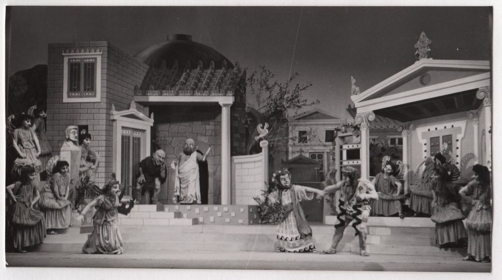 Φωτογραφία, α/μ, φωτογραφικό χαρτί, 6×11,5 εκ., επικολλημένη σε φύλλο χαρτιού Α4 μαζί με τρεις ακόμη φωτογραφίες. Στιγμιότυπο από την παράσταση το 1951.