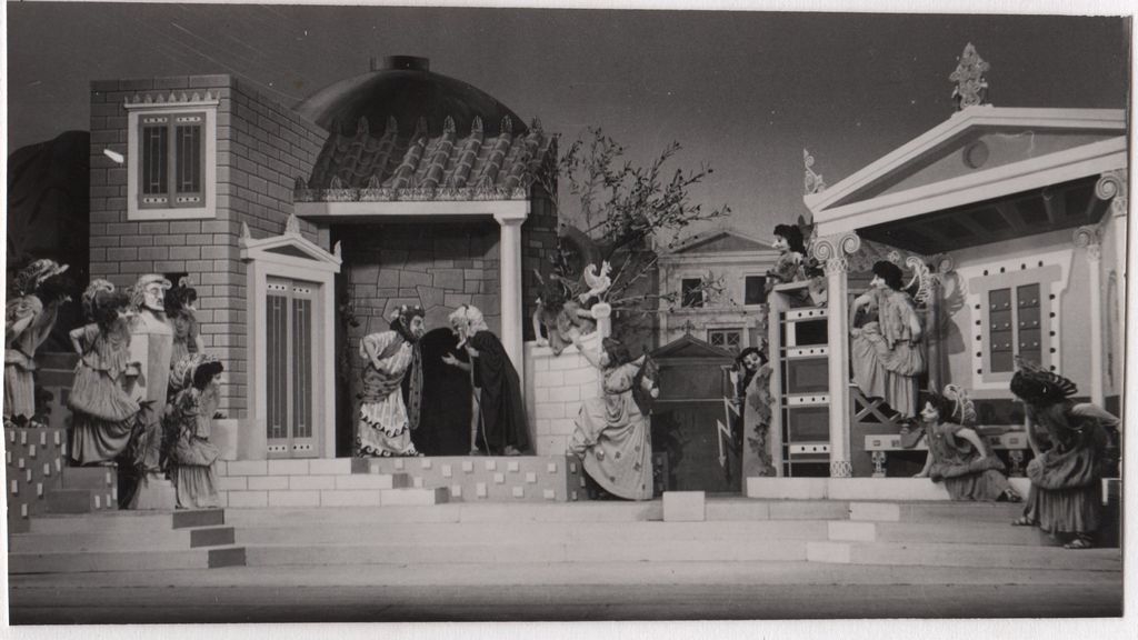 Φωτογραφία, α/μ, φωτογραφικό χαρτί, 6×11,5 εκ., επικολλημένη σε φύλλο χαρτιού Α4 μαζί με τρεις ακόμη φωτογραφίες. Στιγμιότυπο από την παράσταση το 1951.