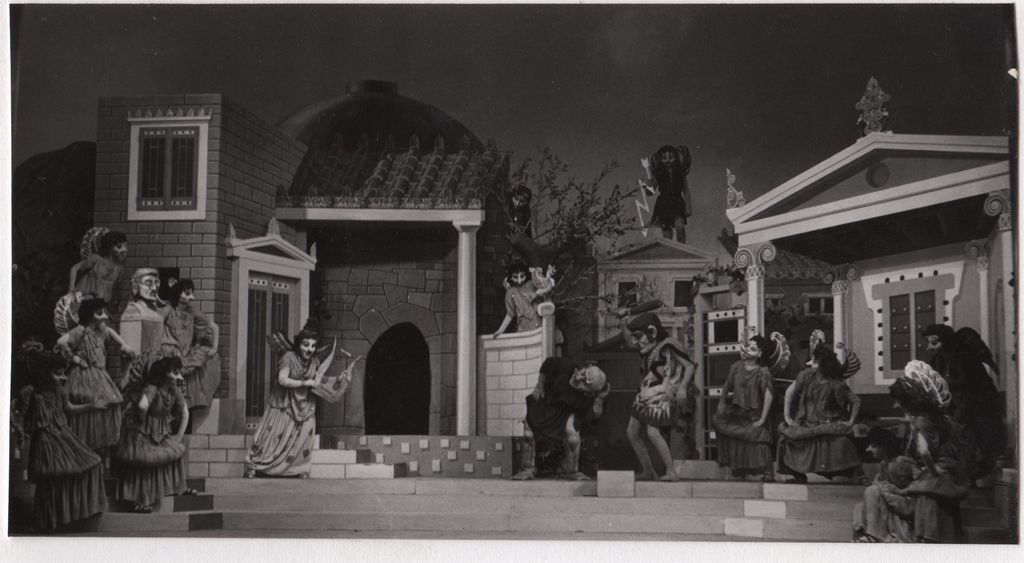 Φωτογραφία, α/μ, φωτογραφικό χαρτί, 6×11 εκ., επικολλημένη σε φύλλο χαρτιού Α4 μαζί δύο ακόμη φωτογραφίες. Στιγμιότυπο από την παράσταση το 1951.