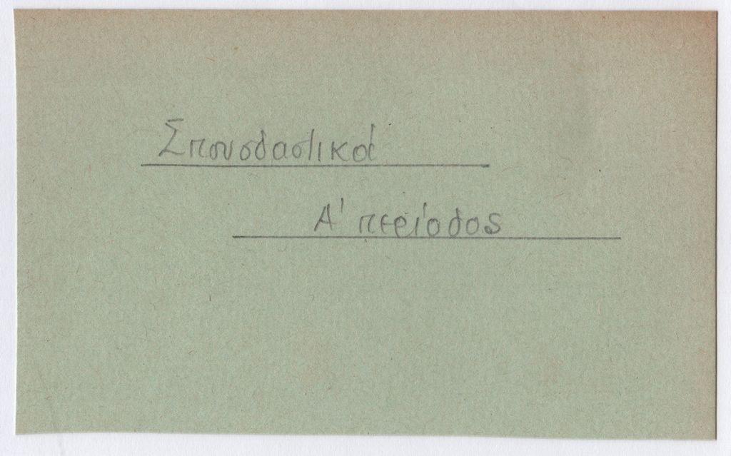 Αυτοσχέδια ετικέτα ενότητας σε κάρτα, χαρτόνι, με χειρόγραφη επιγραφή στα ελληνικά. Βρέθηκε επικολλημένη σε φύλλο χαρτιού Α4 μαζί με ένα ακόμη τεκμήριο
