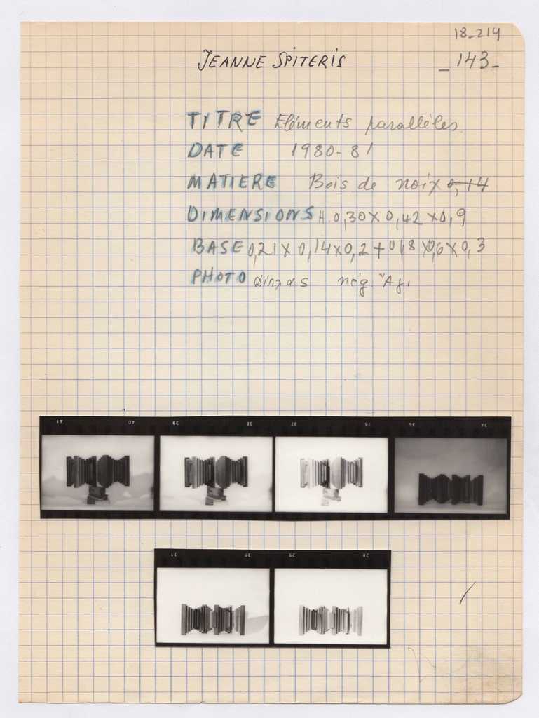 Απόκομμα, χαρτί, μία όψη, 22×16 εκ., επικολλημένο σε φύλλο χαρτιού Α4. Φόρμα καταγραφής στοιχείων έργου, χειρόγραφη, με μαύρο και μπλε μελάνι και μολύβι, στα γαλλικά και ελληνικά, όπου είναι επικολλημένες έξι φωτογραφίες του έργου, α/μ, φωτογραφικό χαρτί, όλες 2,5×3,5 εκ.